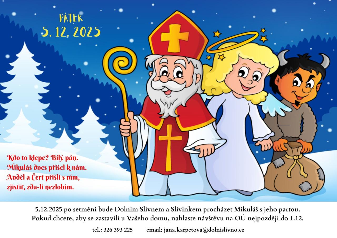 Dolním Slivnem a Slivínkem bude 5. prosince po setmění procházet Mikuláš se svojí partou. Pokud si budete přát jejich návštěvu, nahlaste se na OÚ nejpozději do 1. prosince. Možno využít také tel.: 326 393 225, paní Karpetová. Děkujeme.