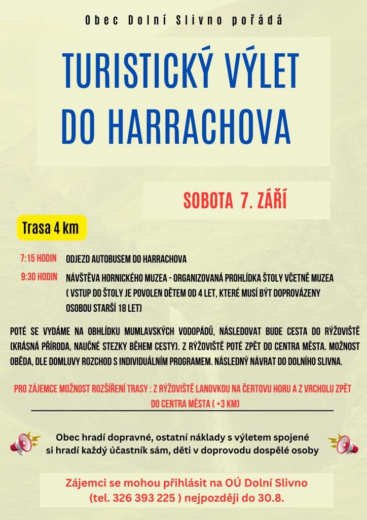 Pojeďte s námi 7.9. na výlet! Připravili jsme pro Vás lehkou turistiku v Harrachově. Navštívíme Hornické muzeum včetně štoly a dojdeme k Mumlavským vodopádům. Přihlášky na OÚ, více info na plakátu. Odjezd z autobusové zastávky v 7:15 hodin, těšíme se!