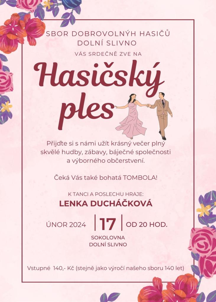 Sbor dobrovolných hasičů Dolní Slivno Vás srdečně zve na tradiční hasičský ples, který se uskuteční v sobotu 17.2.2024 od 20 hodin na sále Sokolovny v Dolním Slivně. Čeká Vás bohatá tombola, výborné občerstvení a k tanci a poslechu zahraje Lenka Ducháčková. Těšíme se na Vaši účast!