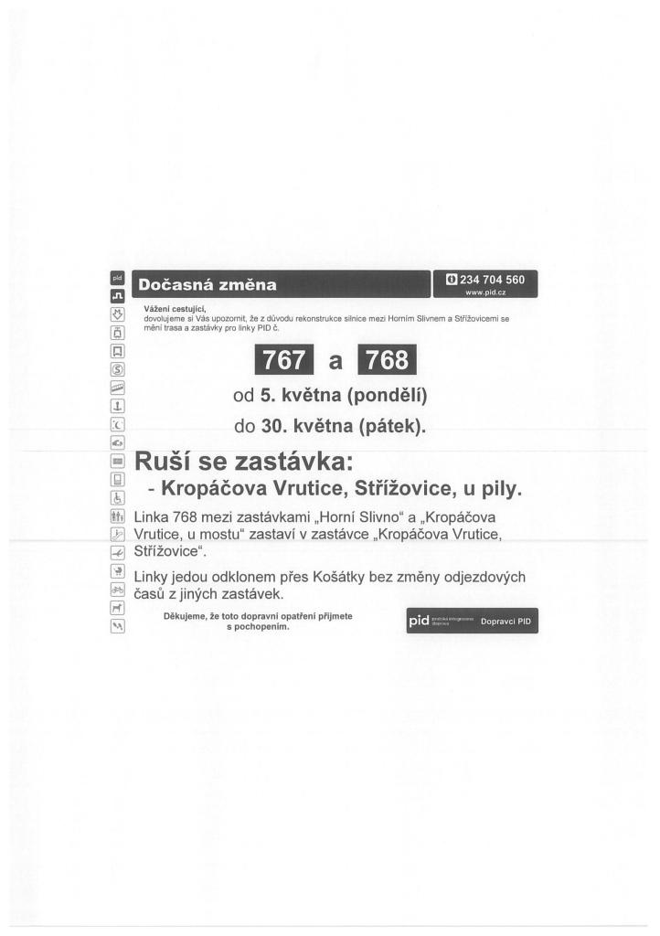 Od 5.5.2025 do 30.05.2025 dojde k dočasné změně jízdních řádů linek 767 a 768. Linky povedou přes Košátky.Dojde k dočasnému zrušení zastávky-Kropáčova Vrutice, Střížovice - u pily. Viz přiložený letáček.Dále informujeme o uzavření silnice Dolní Slivno-Stžížovice taktéž v období 5.5.2025-30.05.2025.