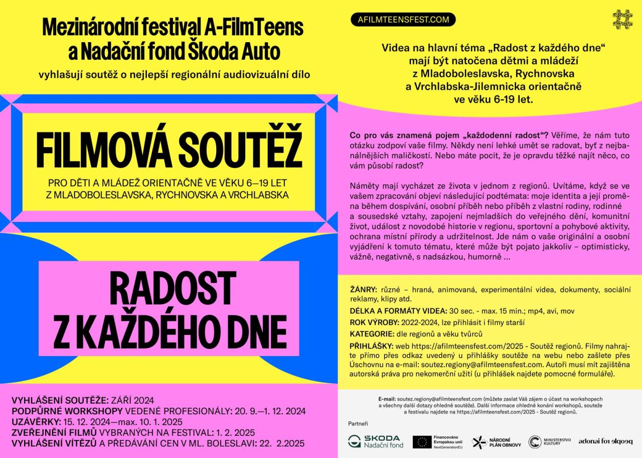 Mezinárodní festival A-FilmTeens a Nadační fond Škoda Auto vyhlašují soutěž o nejlepší regionální a audiovizuální dílo. Soutěž je určena pro děti a mládež 6-19 let.