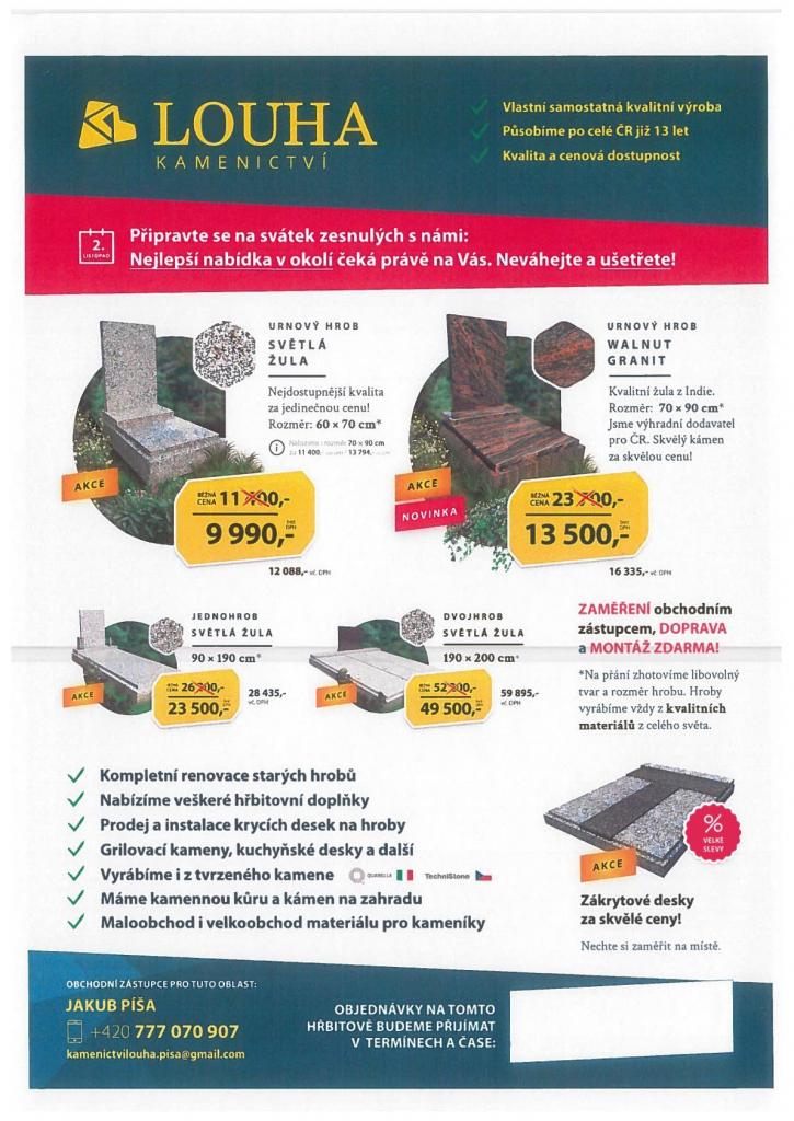 Dne 19.10.23 bude v čase 11:45-12:05 zástupce Kamenictví Louha na hřbitově u vchodu nabízet kamenické služby.