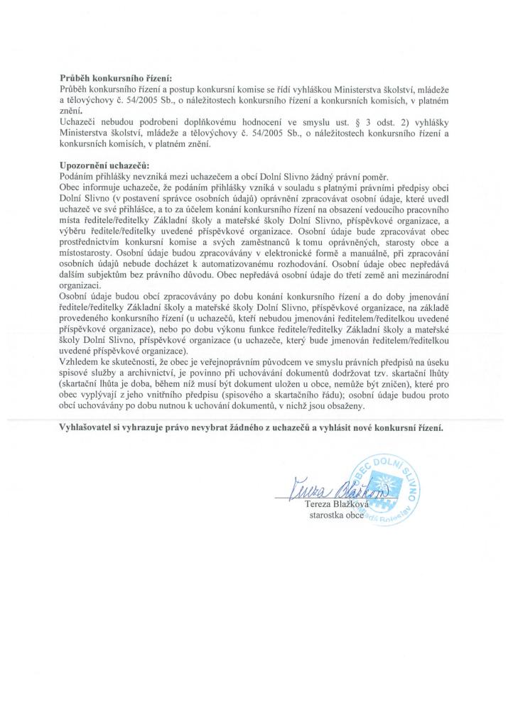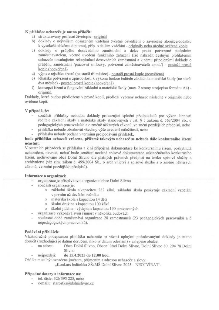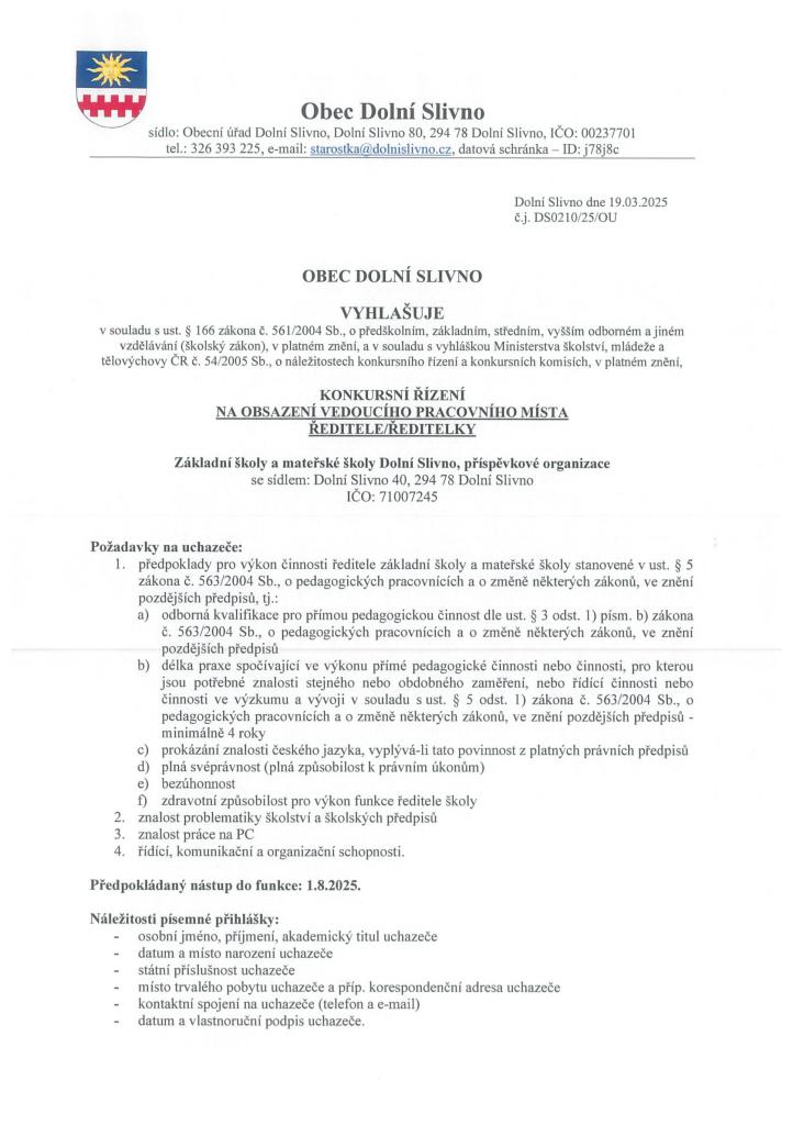 ZŠ A MŠ DOLNÍ SLIVNO VYHLAŠUJE KONKURSNÍ ŘÍZENÍ NA OBSAZENÍ VEDOUCÍHO PRACOVNÍHO MÍSTA ŘEDITELE/ŘEDITELKY