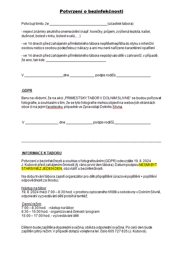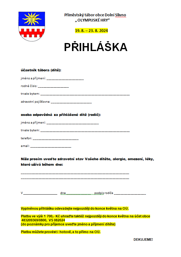 Zveme všechny děti na letní příměstský tábor s názvem Olympijské hry s Asterixem a Obelixem. Tábor bude uskutečněn v termínu 19.-23.8. a přednost budou mít děti ze Slivna a Slivínka. Na děti čeká spousta zábavy a sportu, těšit se mohou na výlet i přespání na sokolovně. Na koho se můžeme letos těšit?