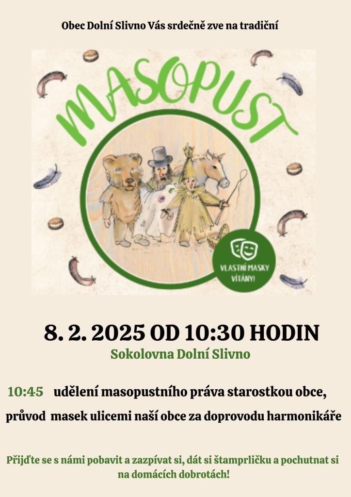 srdečně vás zveme na masopustní průvod, který se uskuteční 8. února! Sraz maškar bude v 10:30 na sokolovně. Přijďte v maskách, připraveni na veselí, tanec a zábavu! K poslechu a tanci nám bude hrát harmonikář. Společně si užijeme tradici, která nás spojuje a přináší radost.