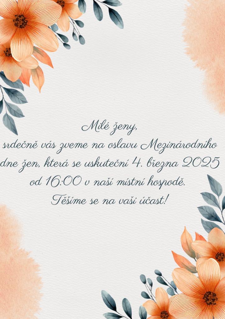 srdečně vás zveme na oslavu Mezinárodního dne žen, která se uskuteční 4. března 2025 od 16:00 v naší místní hospodě. Přijďte si užít příjemné odpoledne plné rozhovorů, smíchu a oslav našeho svátku. Těšíme se na setkání s vámi, kde společně vytvoříme nezapomenutelnou atmosféru!