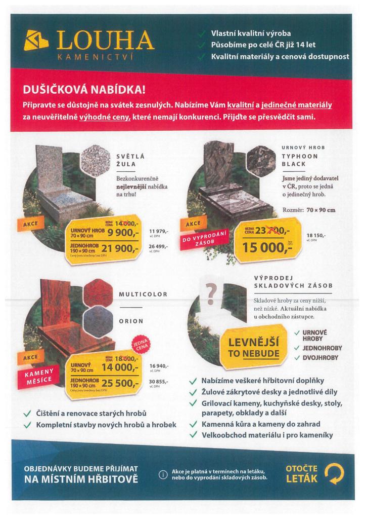 Kamenictví Louha s.r.o. informuje občany Dolního Slivna o návštěvě svého obchodního zástupce na místním hřbitově a to ve dnech 17.10.2024 a 31.10.2024 v čase 11:45 - 12:05 hod. Zástupce, pan Jiří Janč, poskytne poradenství a cenové nabídky na nové hroby či renovace. Součástí nabídky je slevový kupon pro e-shop.