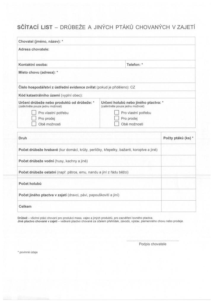 Je nařízeno vyplnit sčítací listy chovatelům drůbeže či domácího ptactva. Zejména chovatelé – slepic, kachen, hus, perliček, krůt, ale také holubů, papoušků, pštrosů, pávů či bažantů.