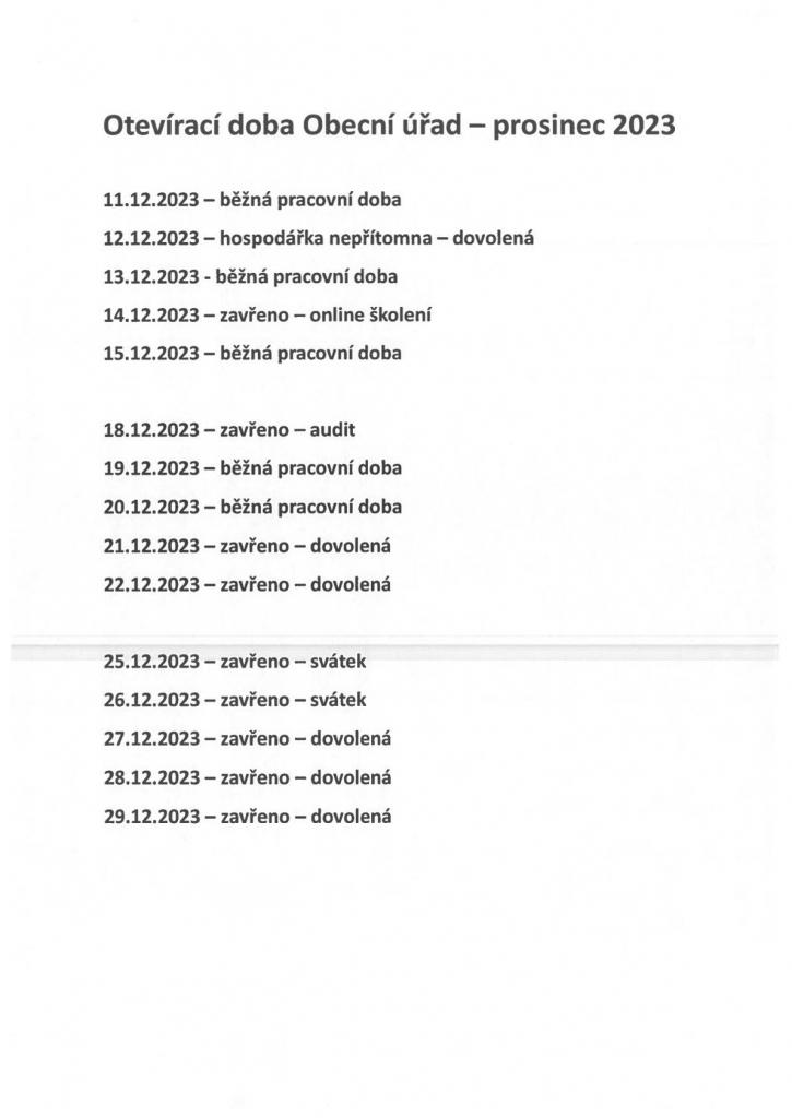 Otevírácí doba Obecního úřadu - prosinec 2023