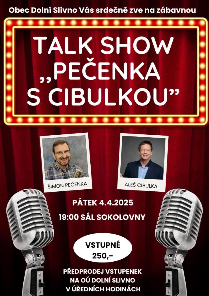 srdečně vás zveme na zábavnou talk show Pečenka s Cibulkou, kterou pořádá obec Dolní Slivno! Přijďte si užít večer plný humoru, skvělých rozhovorů a nezapomenutelných momentů. Akce se uskuteční 4. dubna 2025 od 19:00 hod. na sále sokolovny v Dolním Slivně.