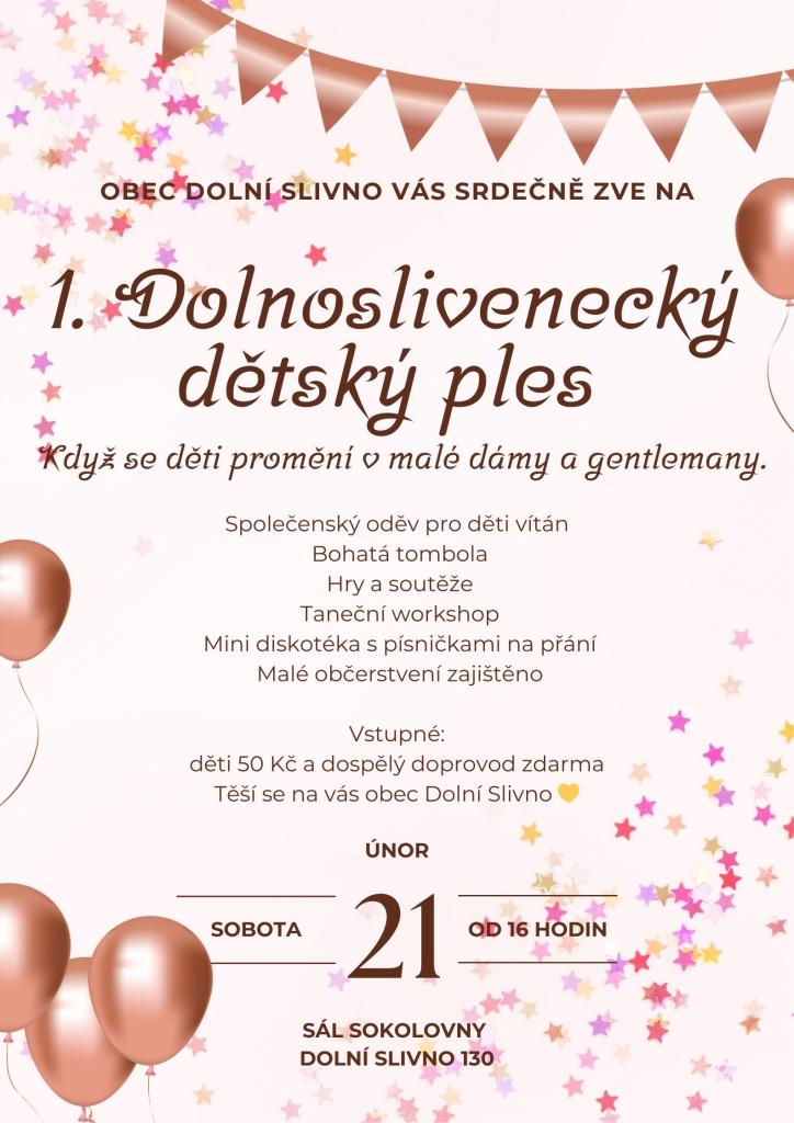 Zveme všechny děti na dětský bál, který se bude konat v sobotu 21. února od 16:00 hodin na sále sokolovny Dolní Slivno. Taneční soutěže pro děti, jednoduchý taneční workshop, občerstvení i tombola a spousta další zábavy. Vstupné je 50,- Kč.