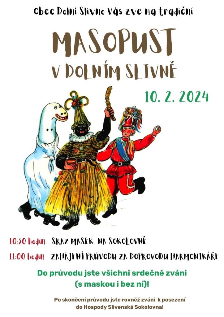 Zveme Vás tradičně do masopustního průvodu obce Dolní Slivno. Sraz všech maškar 10.2.2024 v 10:30 hodin na Sokolovně. Teplé spodní prádlo a dobrou náladu s sebou. Těšíme se na všechny maškary!