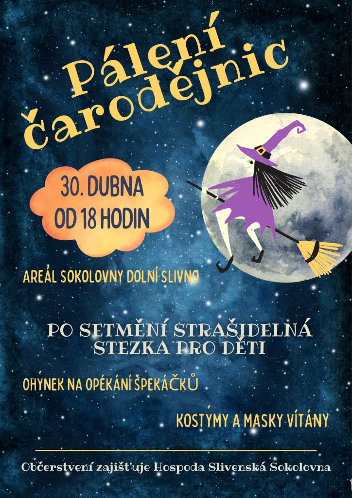 Ve středu 30. dubna Vás zveme na tradiční pálení čarodějnic, které se bude konat v areálu Sokolovny od 18 hodin. Po setmění bude pro děti připravena stezka odvahy s odměnou. Občerstvení zajišťuje Hospoda Slivenská Sokolovna. Těšíme se na setkání!
