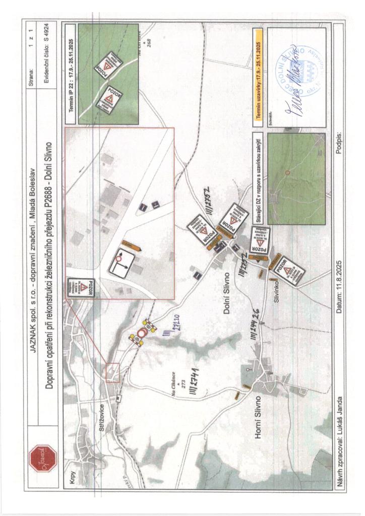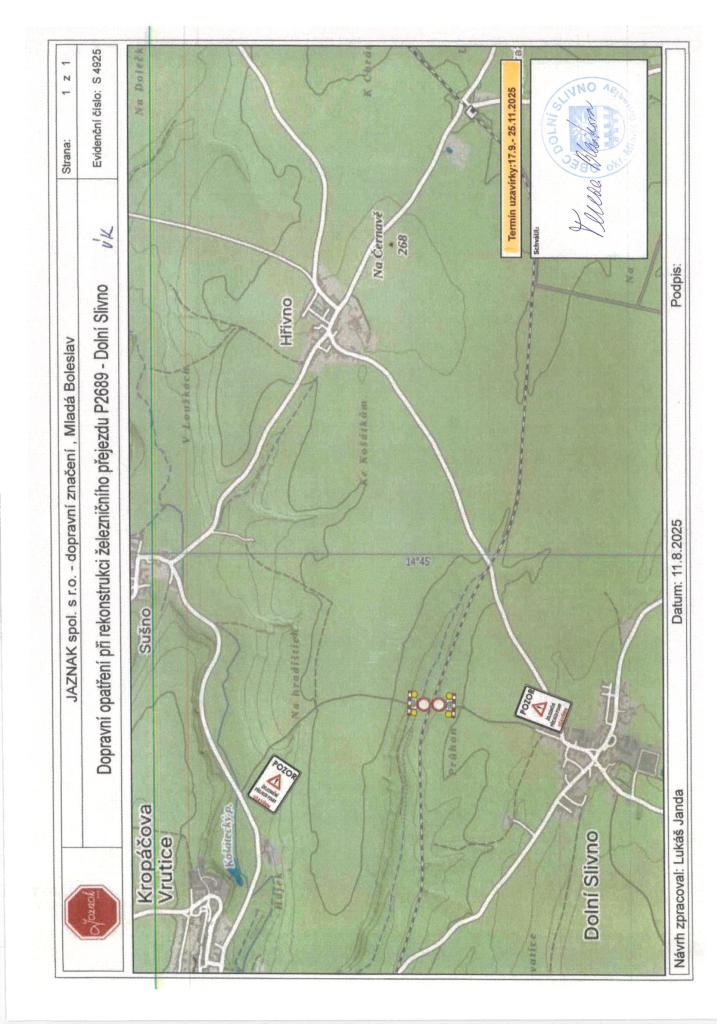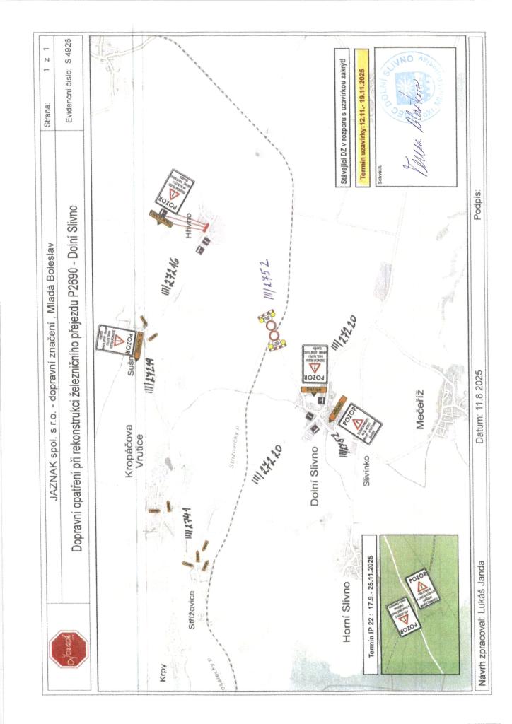 Z důvodu rekonstrukce železniční trati budou v následujících termínech uzavřeny tyto železniční přejezdy : 17.9. - 25.11. 2025 - železniční přejezd mezi Dolním Slivnem a Střížovicemi a železniční přejezd na Jelenštrase 12.11.- 19.11. 2025 - železniční přejezd mezi Dolním Slivnem a Hřivnem