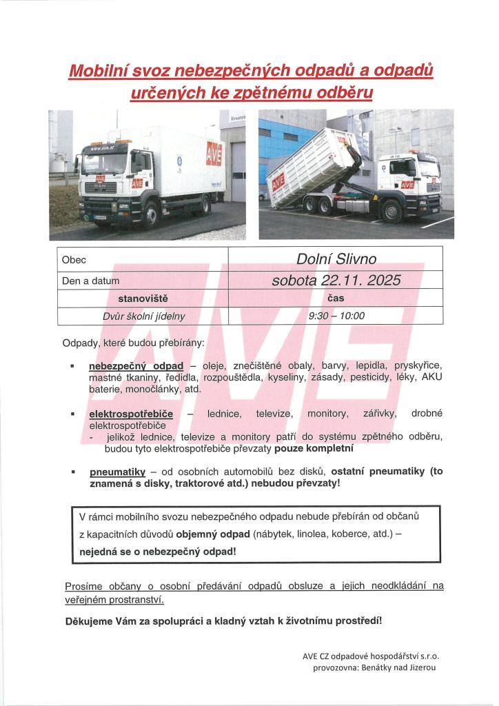 V sobotu 22.11.2025 v čase 09:30 - 10:00 hod. proběhne ve dvoře školní jídelny svoz nebezpečného odpadu.