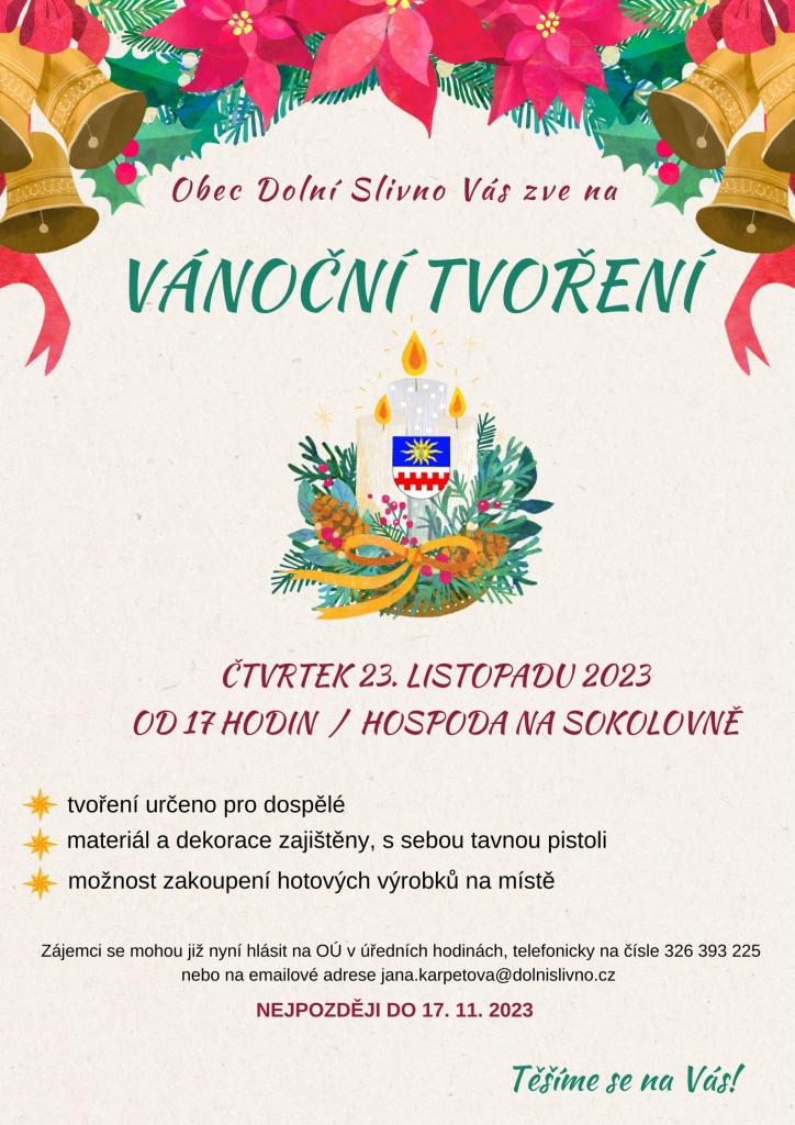 Přijďte si oddychnout, zrelaxovat, vytvořit si hezkou vánoční výzdobu a přitom si popovídat v kolektivu. To vše proběhne ve čtvrtek 23.11.2023 od 17 hodin v hospodě na sokolovně. Zájemci, hlaste se na OÚ. Těšíme se na viděnou!