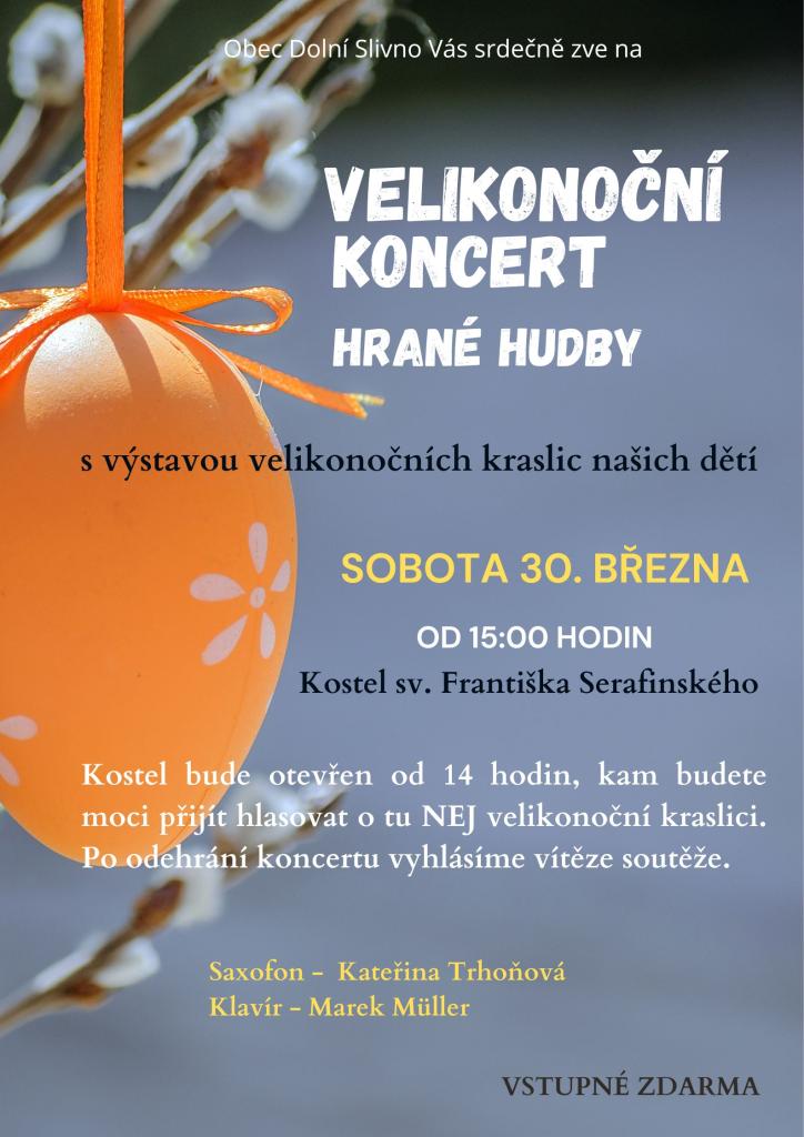Zveme Vás dne 30.3. od 15 hodin do místního kostela na Velikonoční koncert hrané hudby s výstavou soutěže o NEJ kraslici našich dětí. Kostel bude otevřen od 14 hodin, kde budete mít možnost hlasovat v této soutěži. Poté si poslechneme doprovod na klavír a saxofon. Vstupné zdarma.